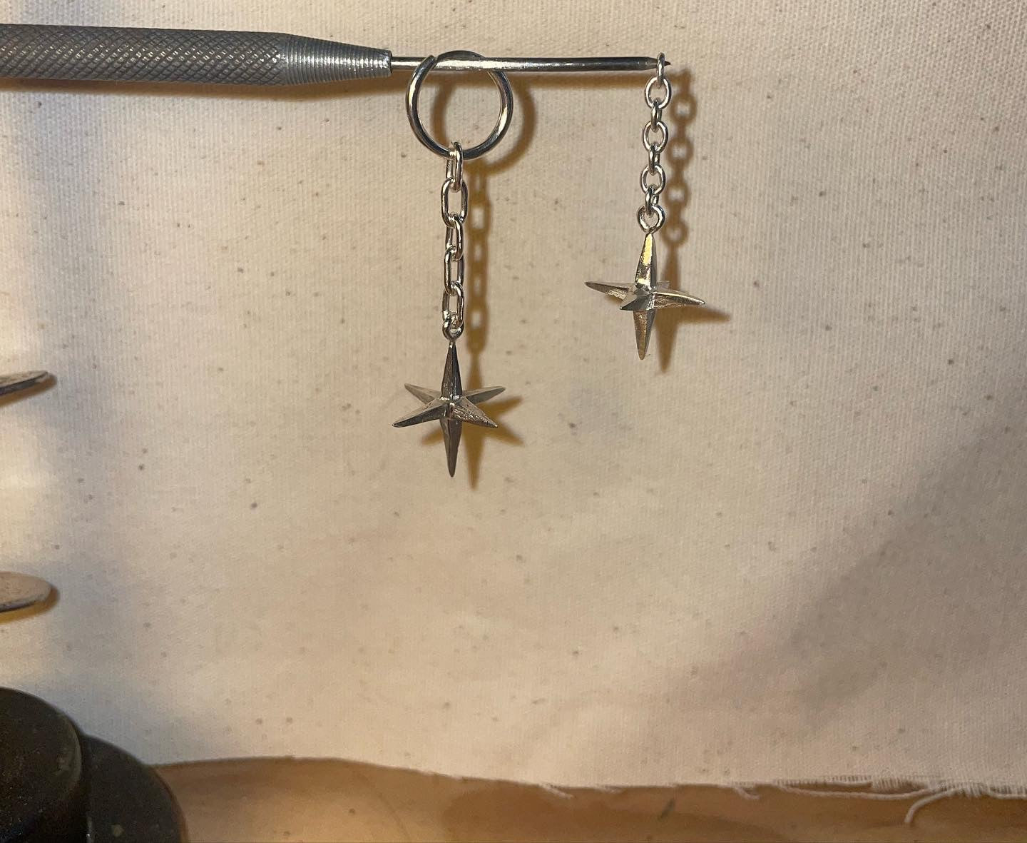 Silver 6-point stars, glimmers of light, in two sizes - small or large. The size difference is only a couple of mm - 18mm large, 16mm small, lengthways.