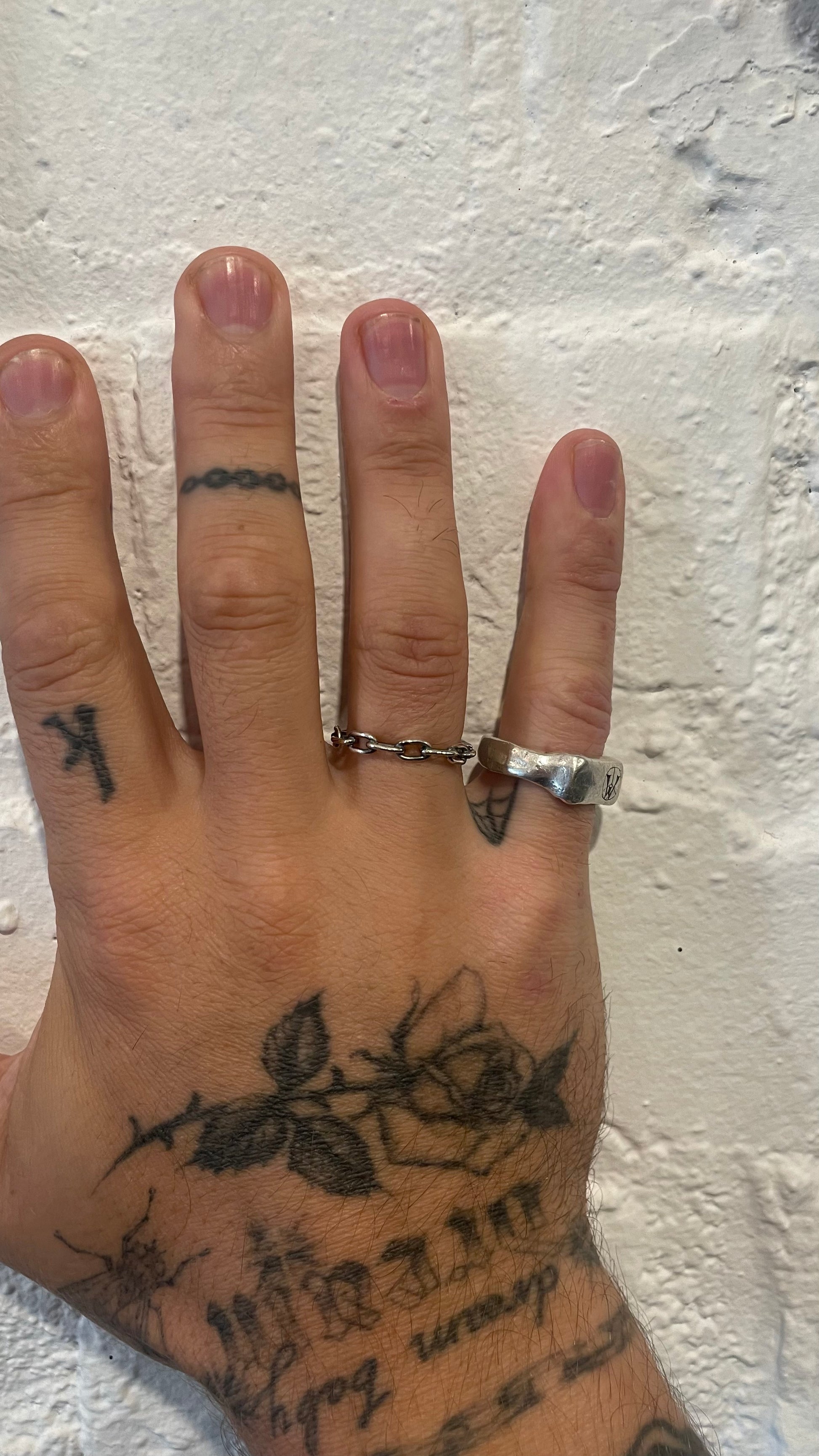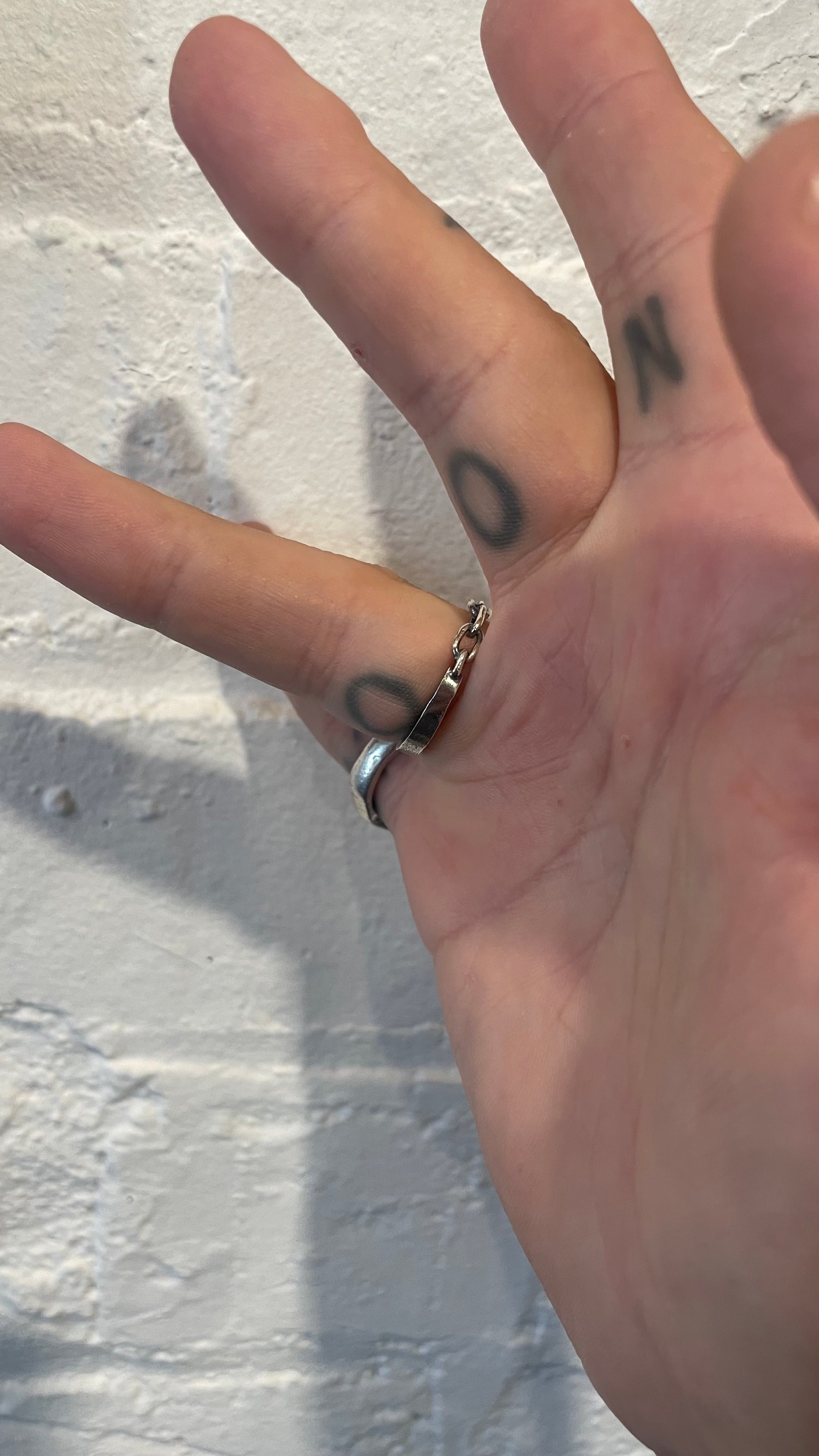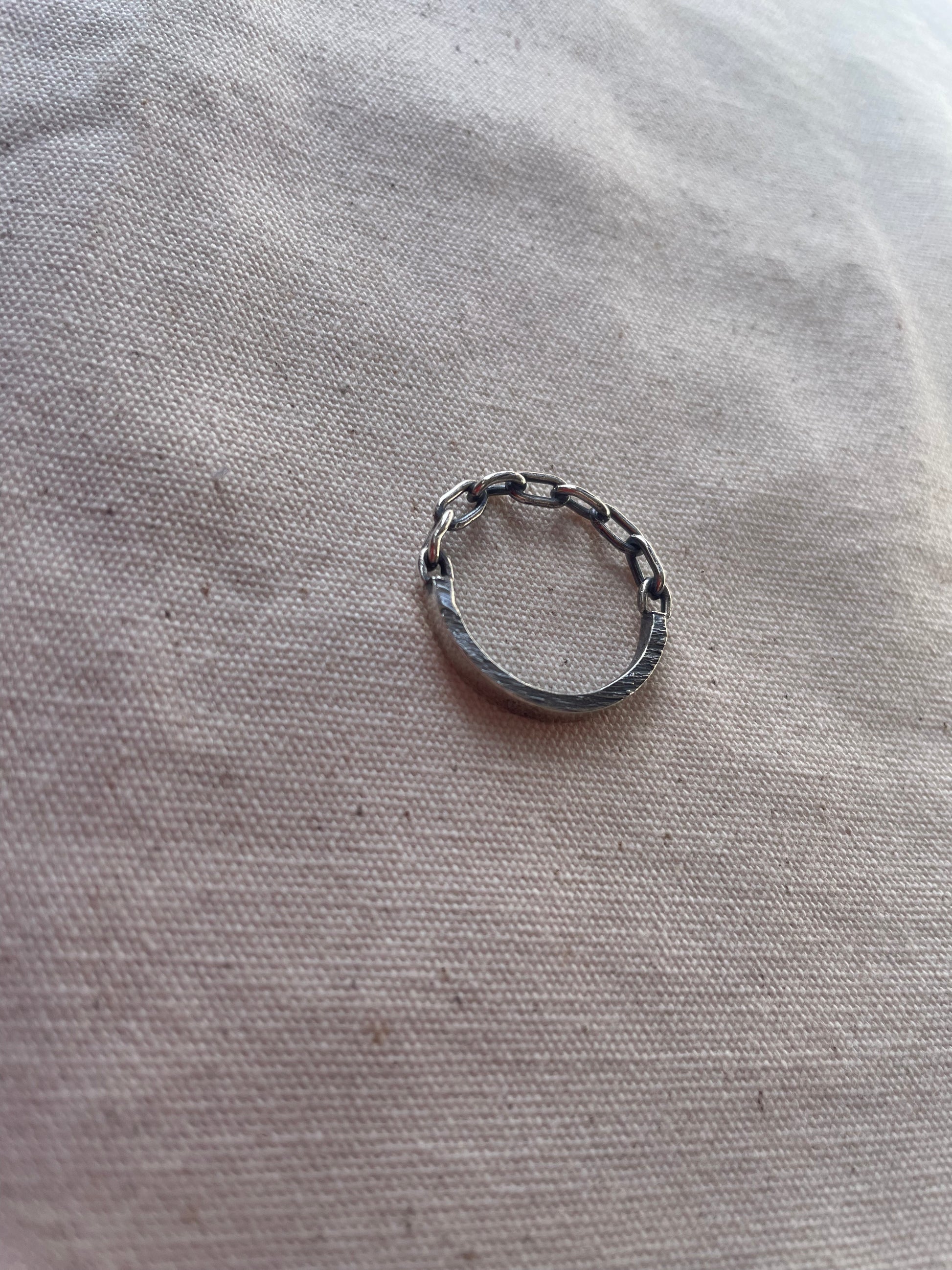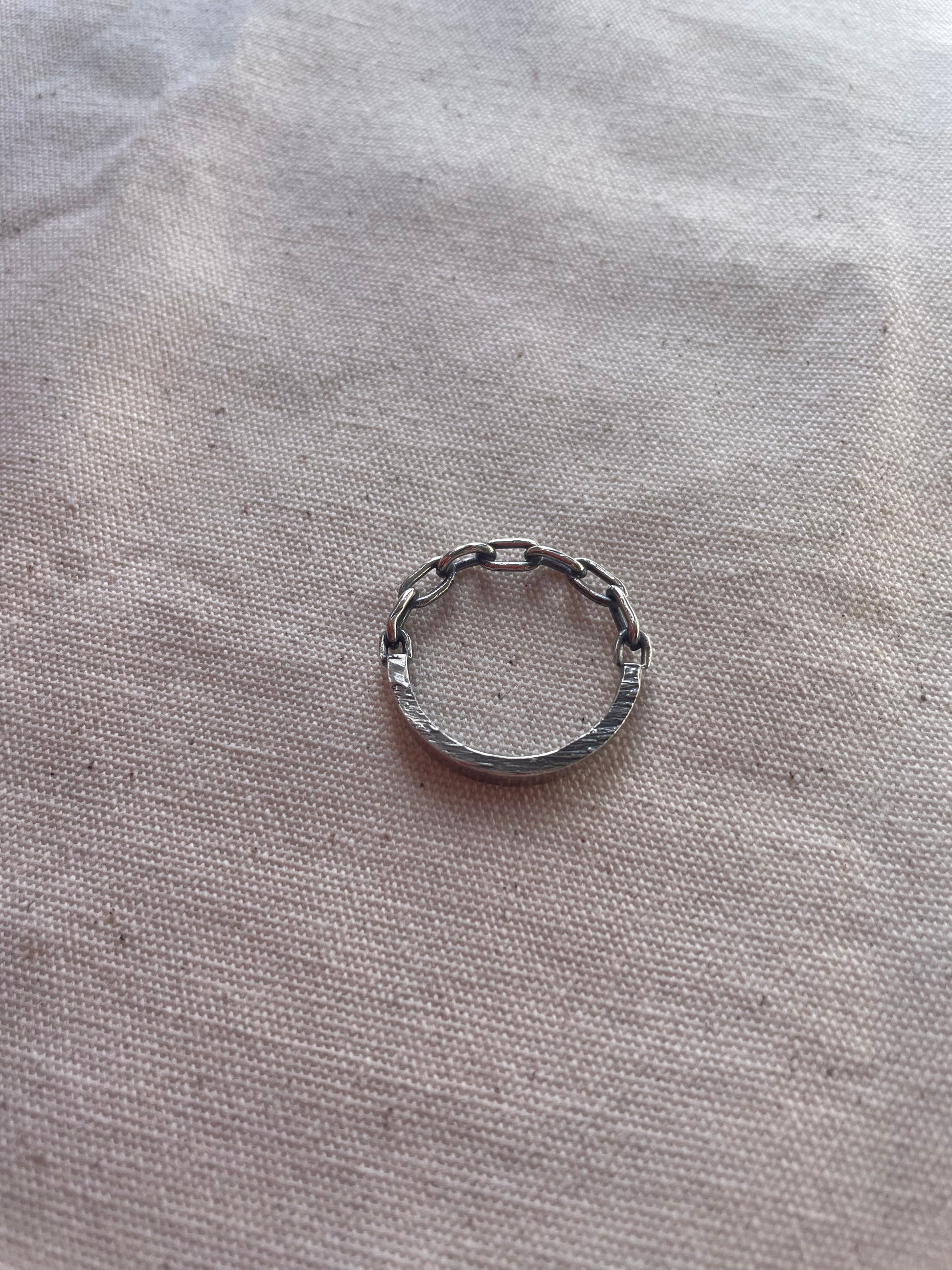 Half a chain ring, half a textured silver band. Please include your size in the notes during checkout!
