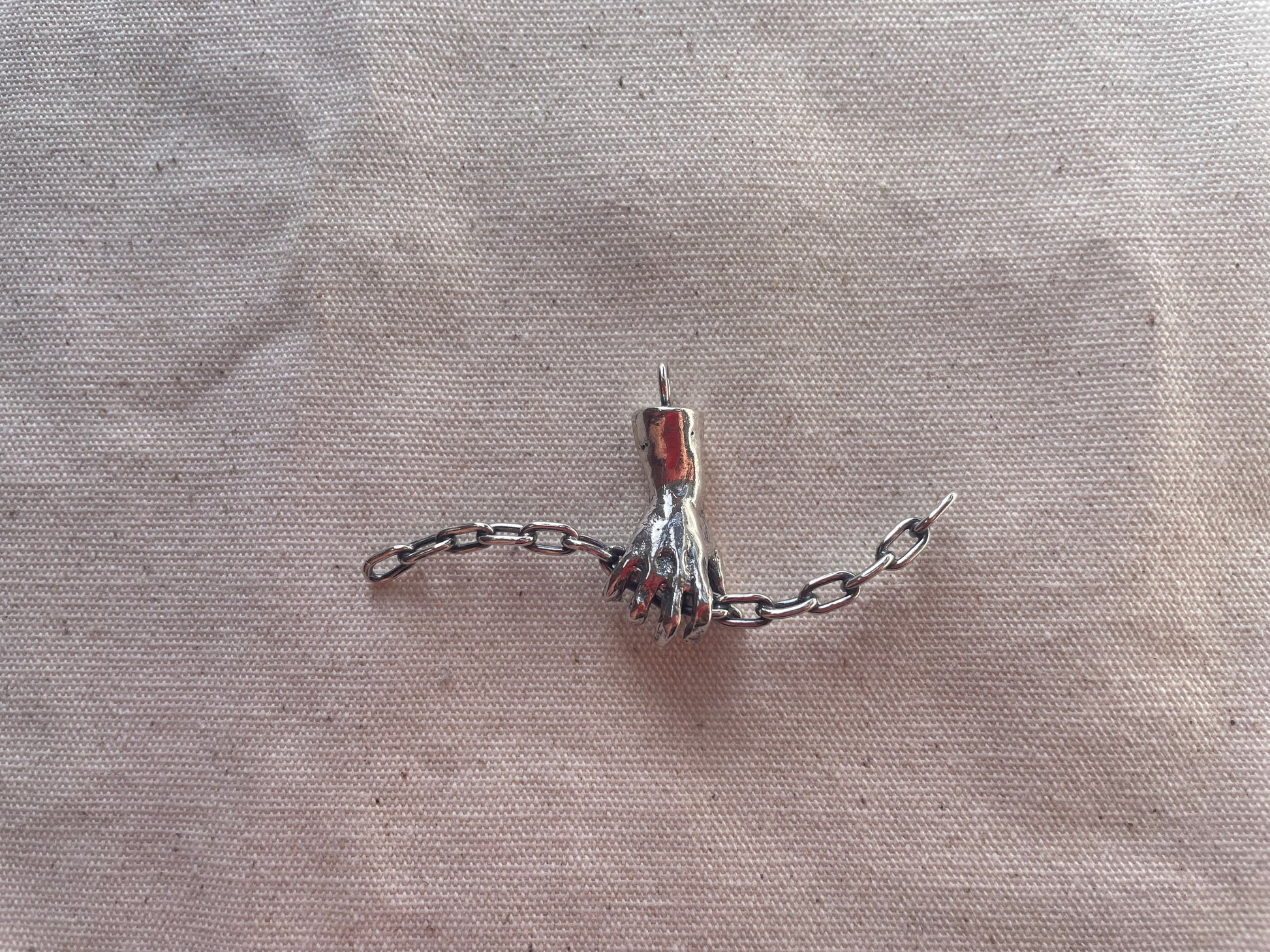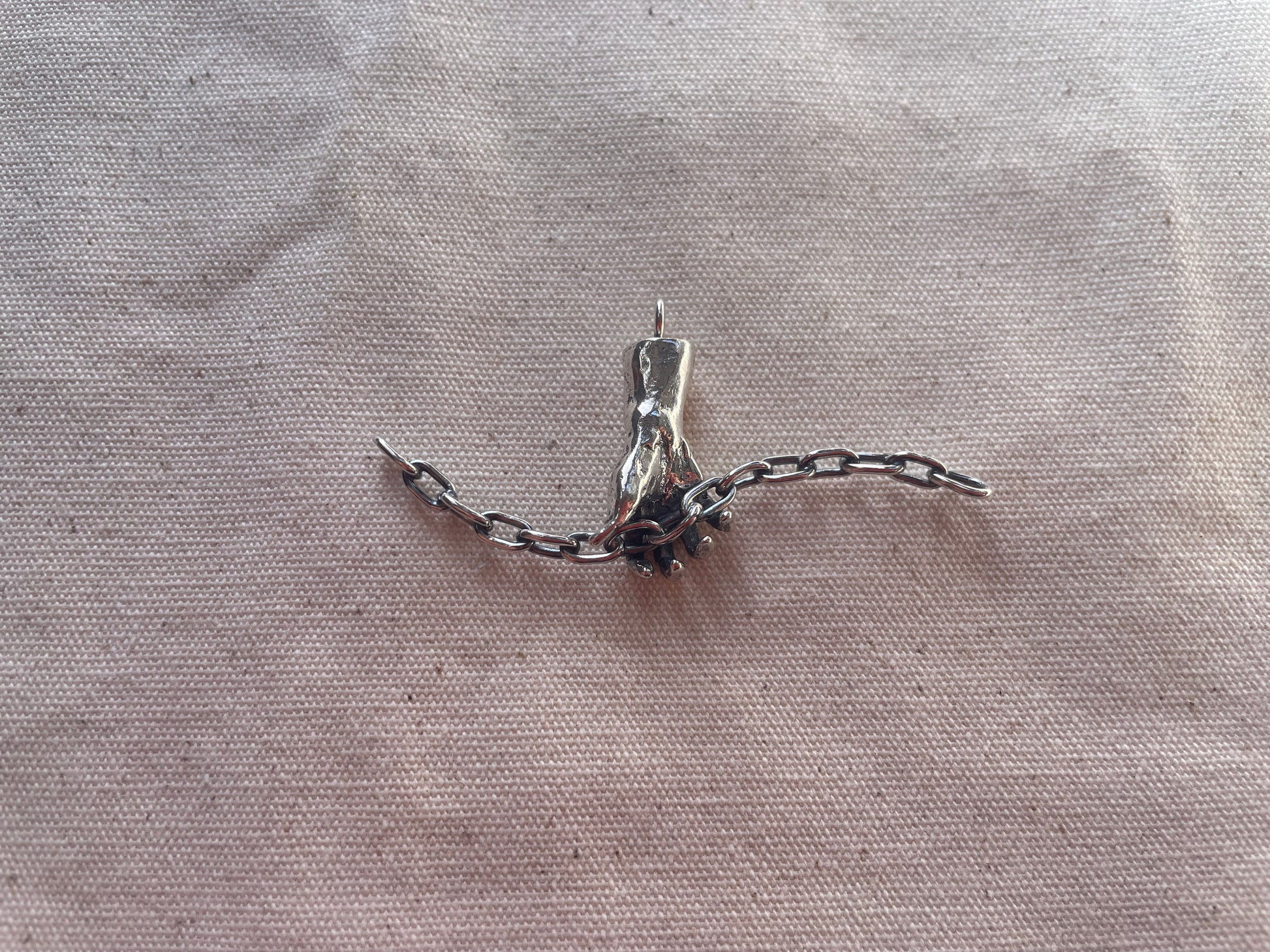 A zero gravity chain formation held by a silver hand. Hung on either a leather cord or a silver chain - or comes as a pendant on its own.
