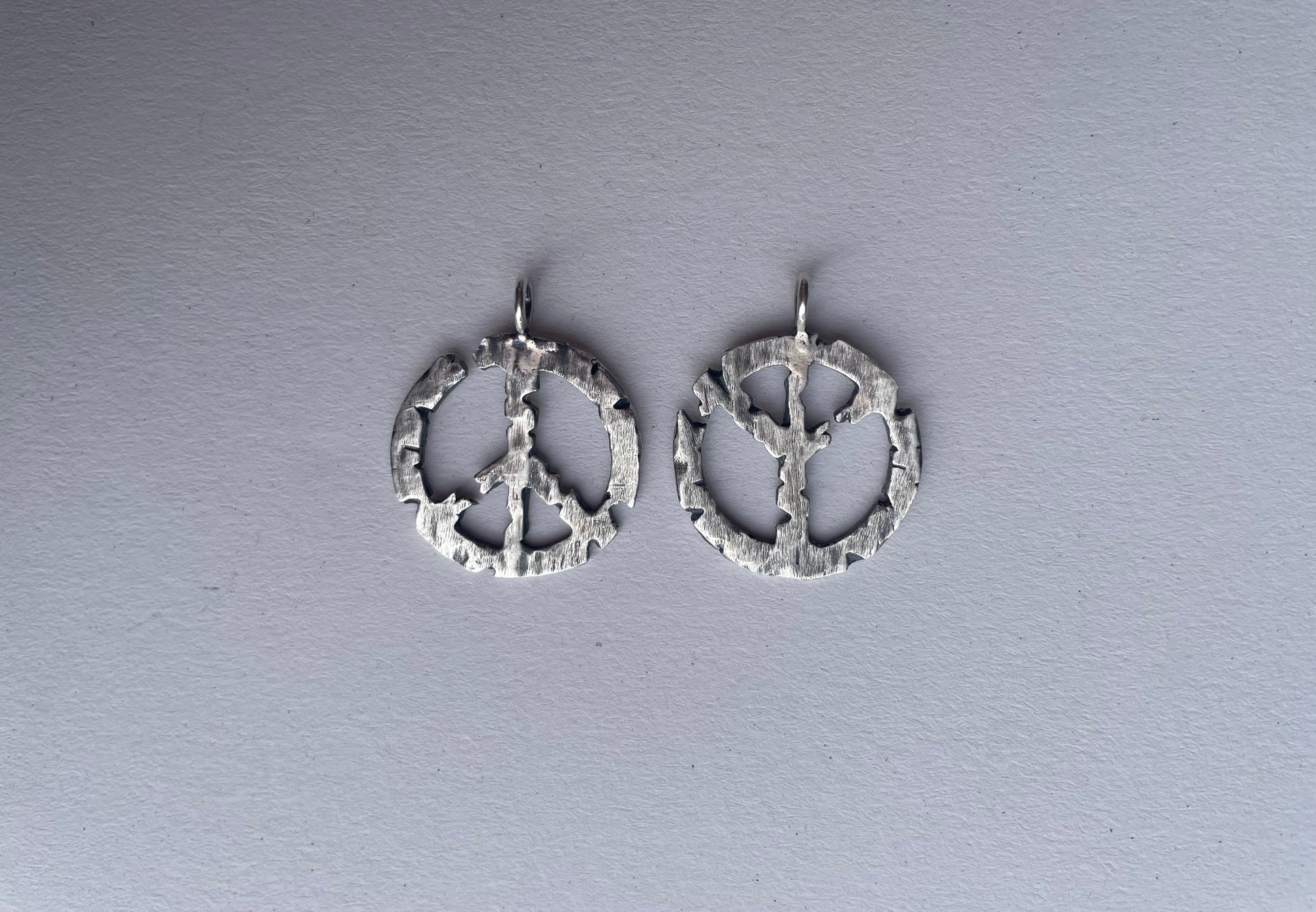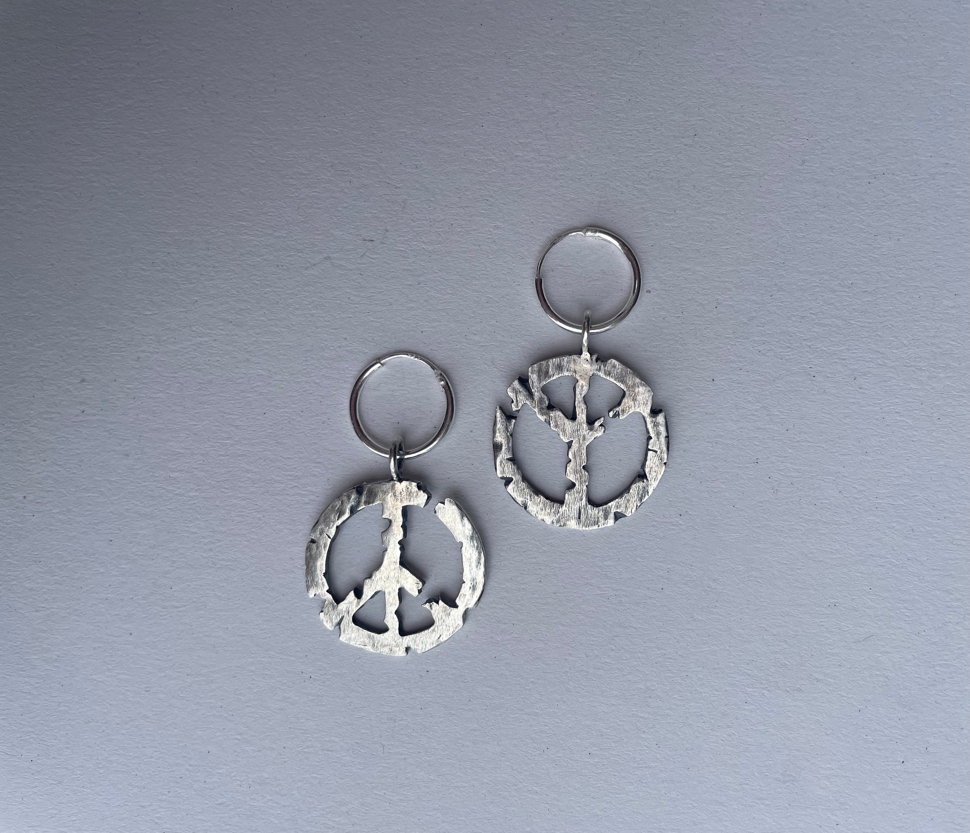 Cracked peace, upright or upside down. Or both. Sterling silver earrings that can be used as pendants for necklaces.