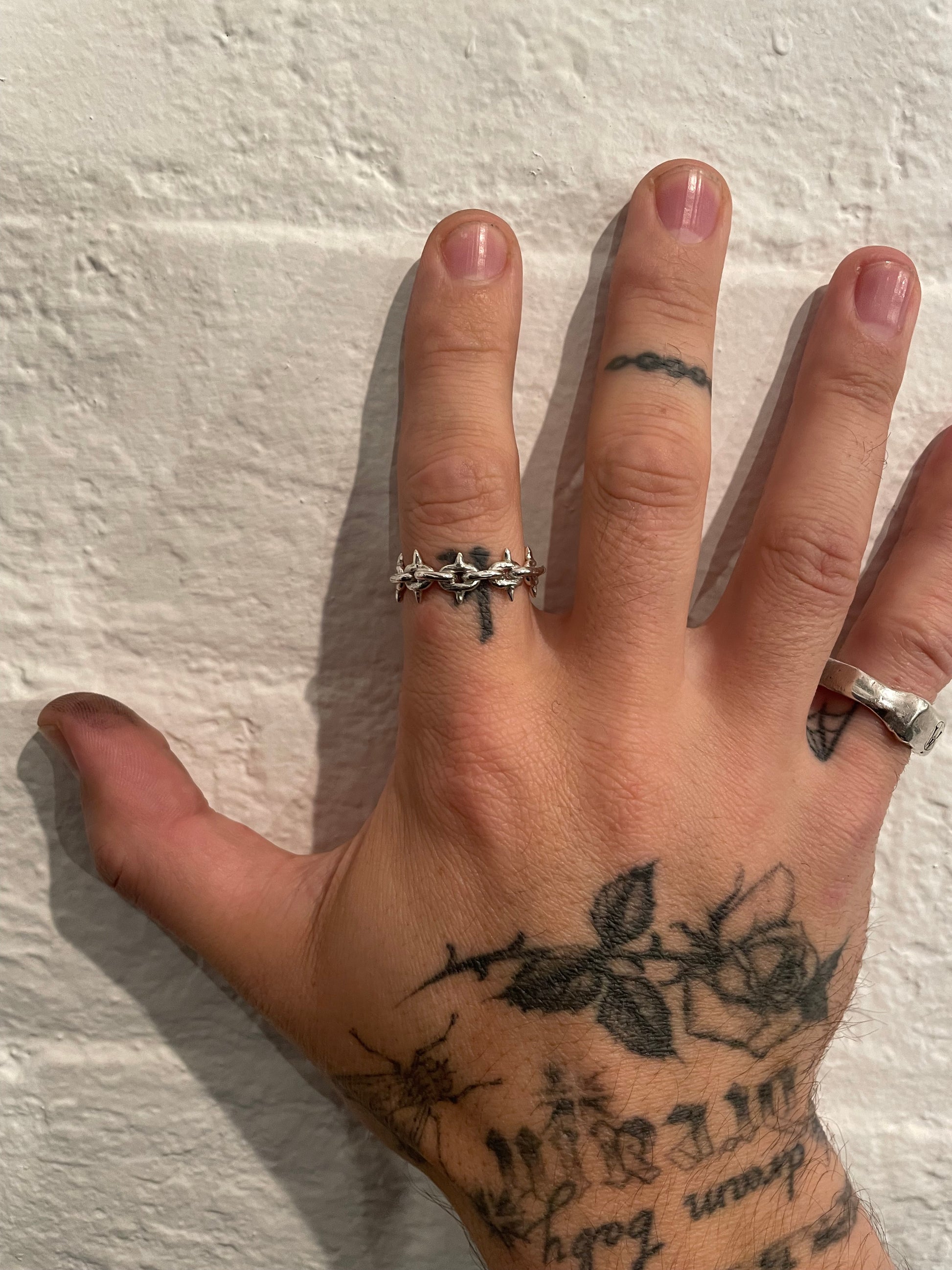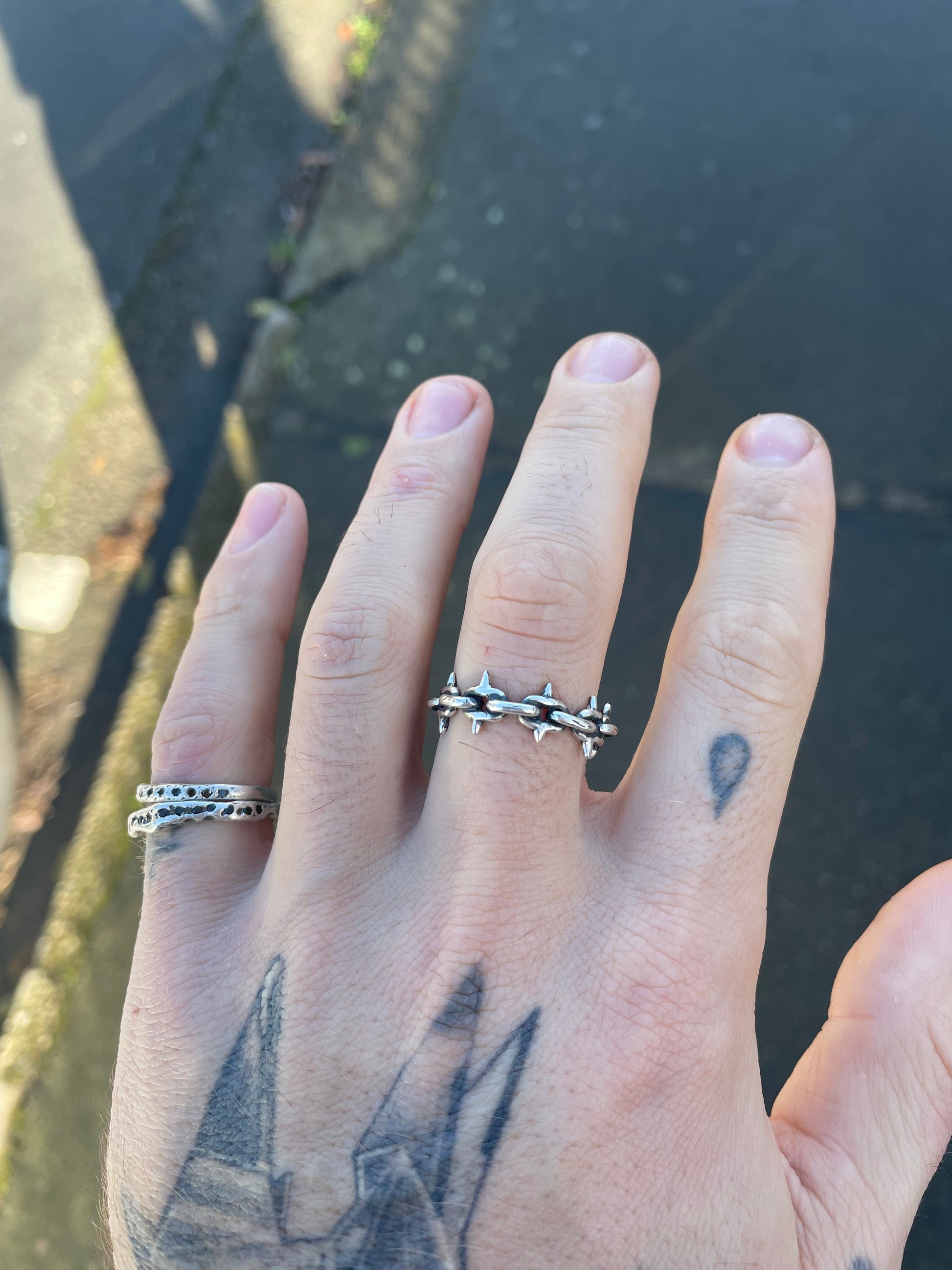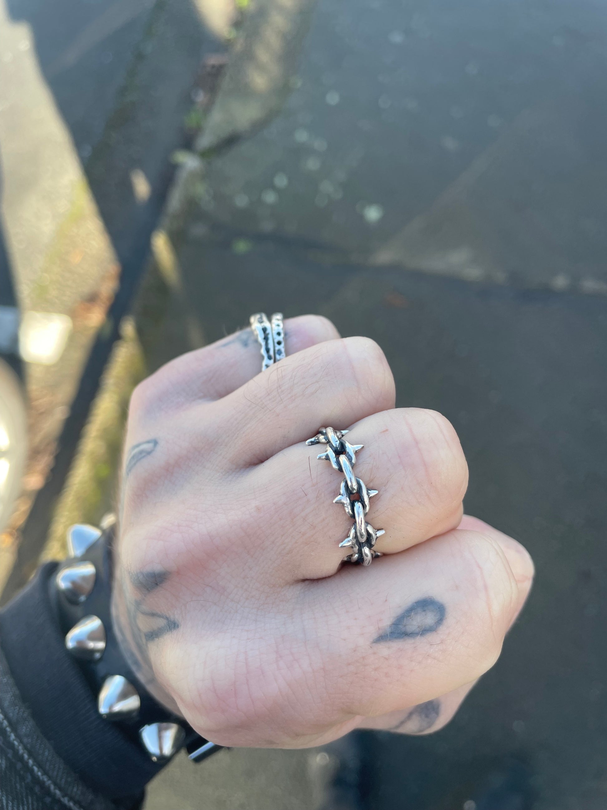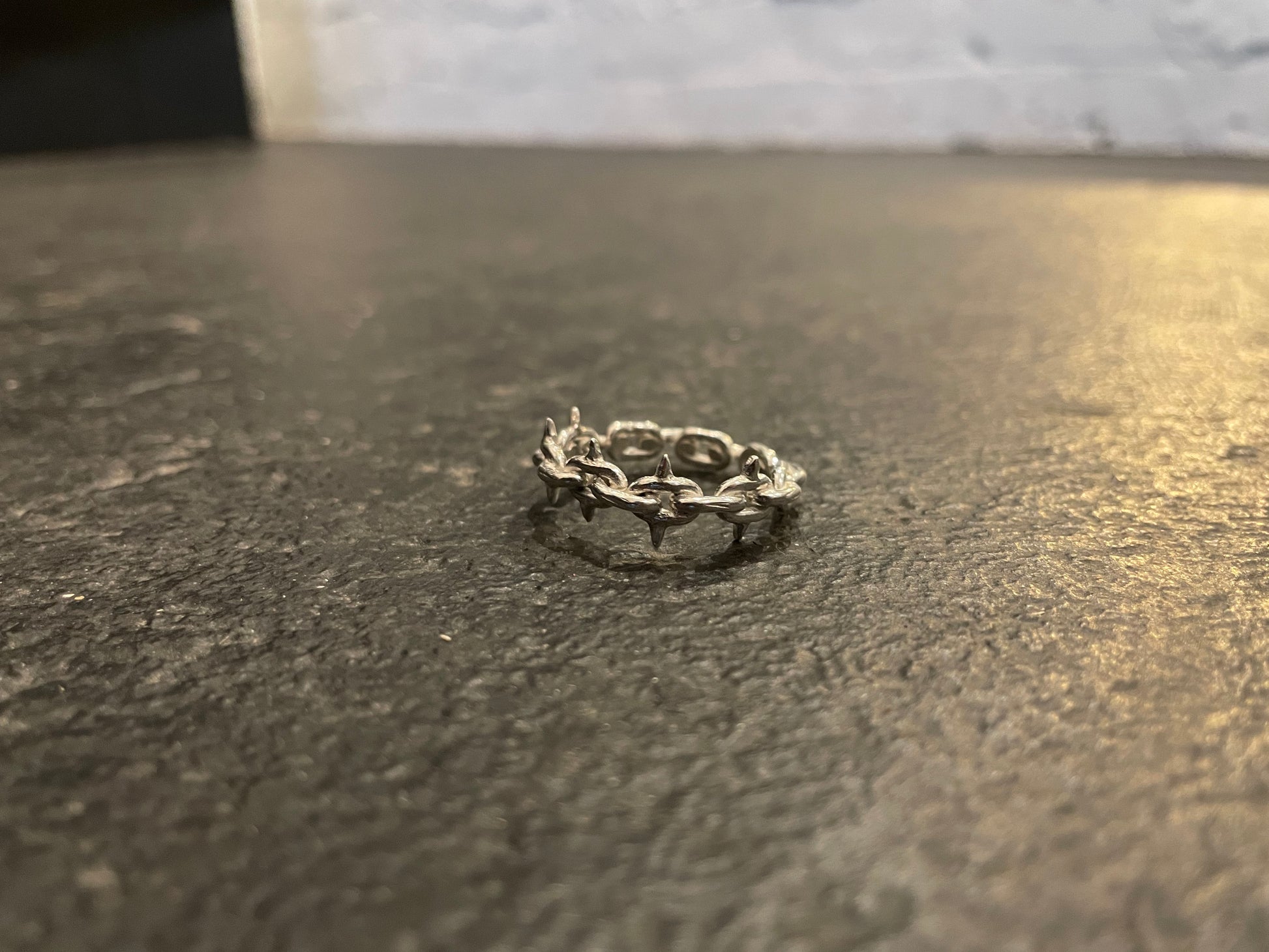 Chain links of silver thorns, continuing my slight obsession with impractical, minor-injury-causing jewellery. Funnily enough.. this is the most sensible out of my sharp objects - the points are dulled slightly and sit parallel to the skin, as to not cause damage. This one's a winner, folks.