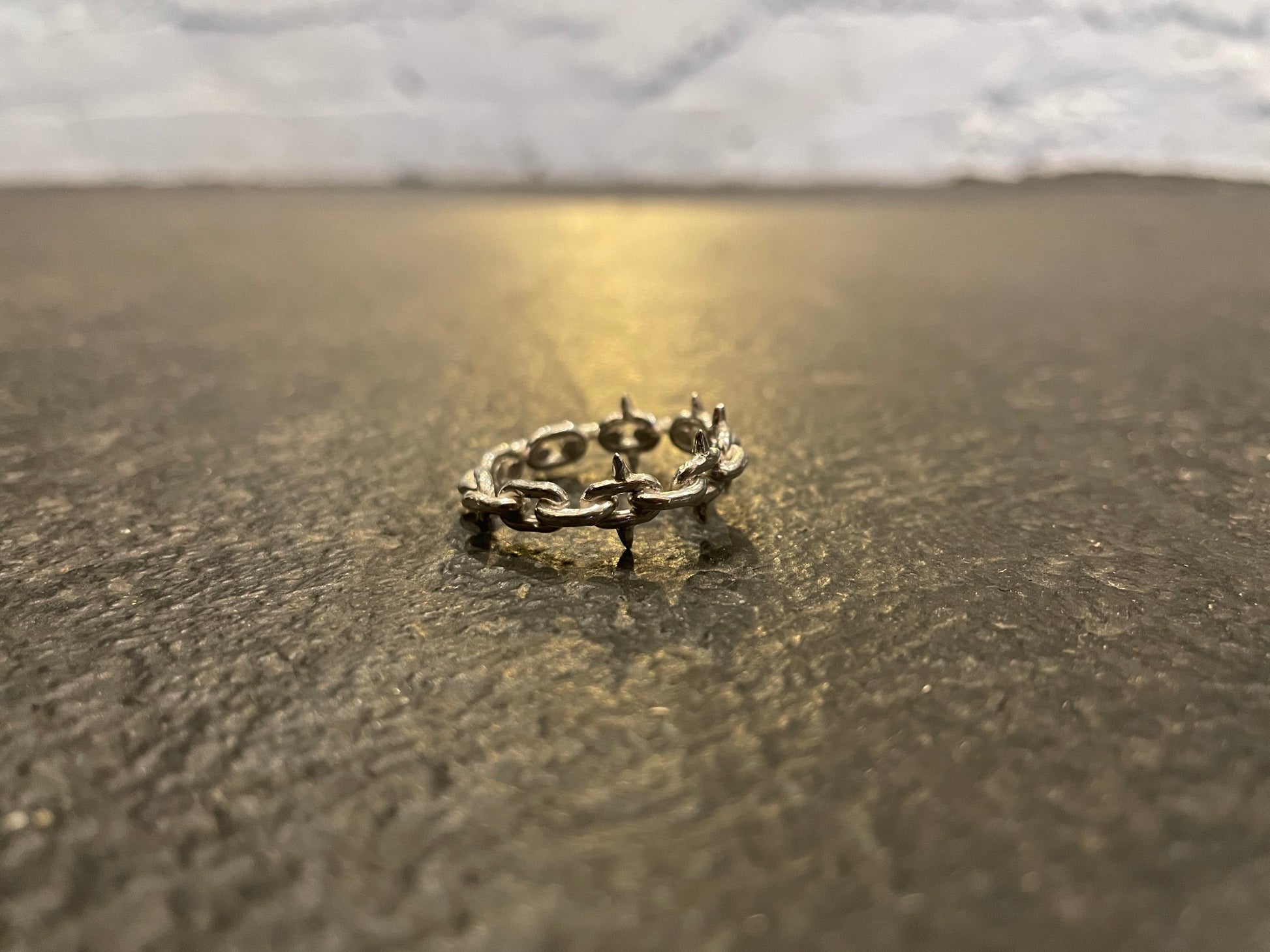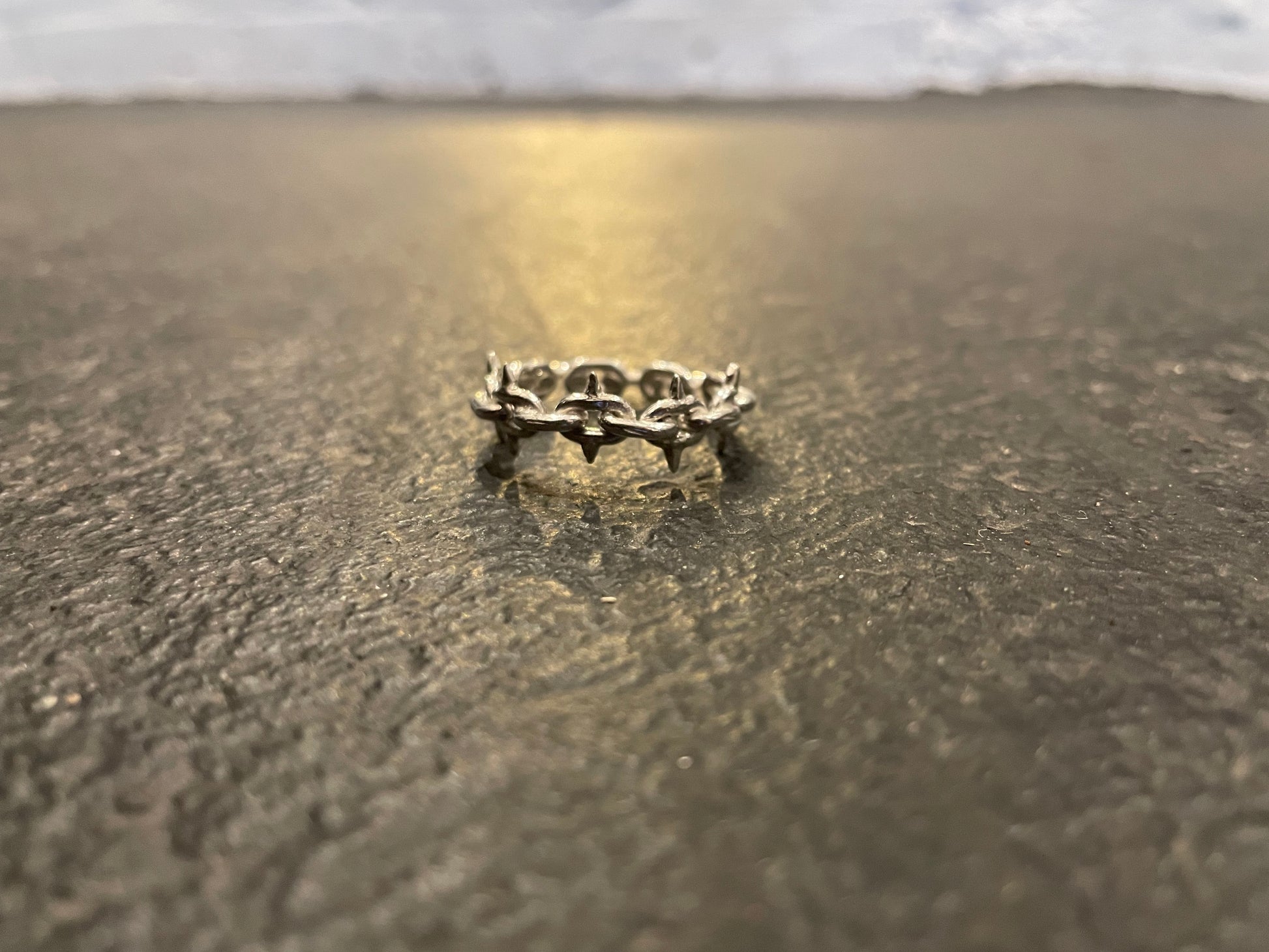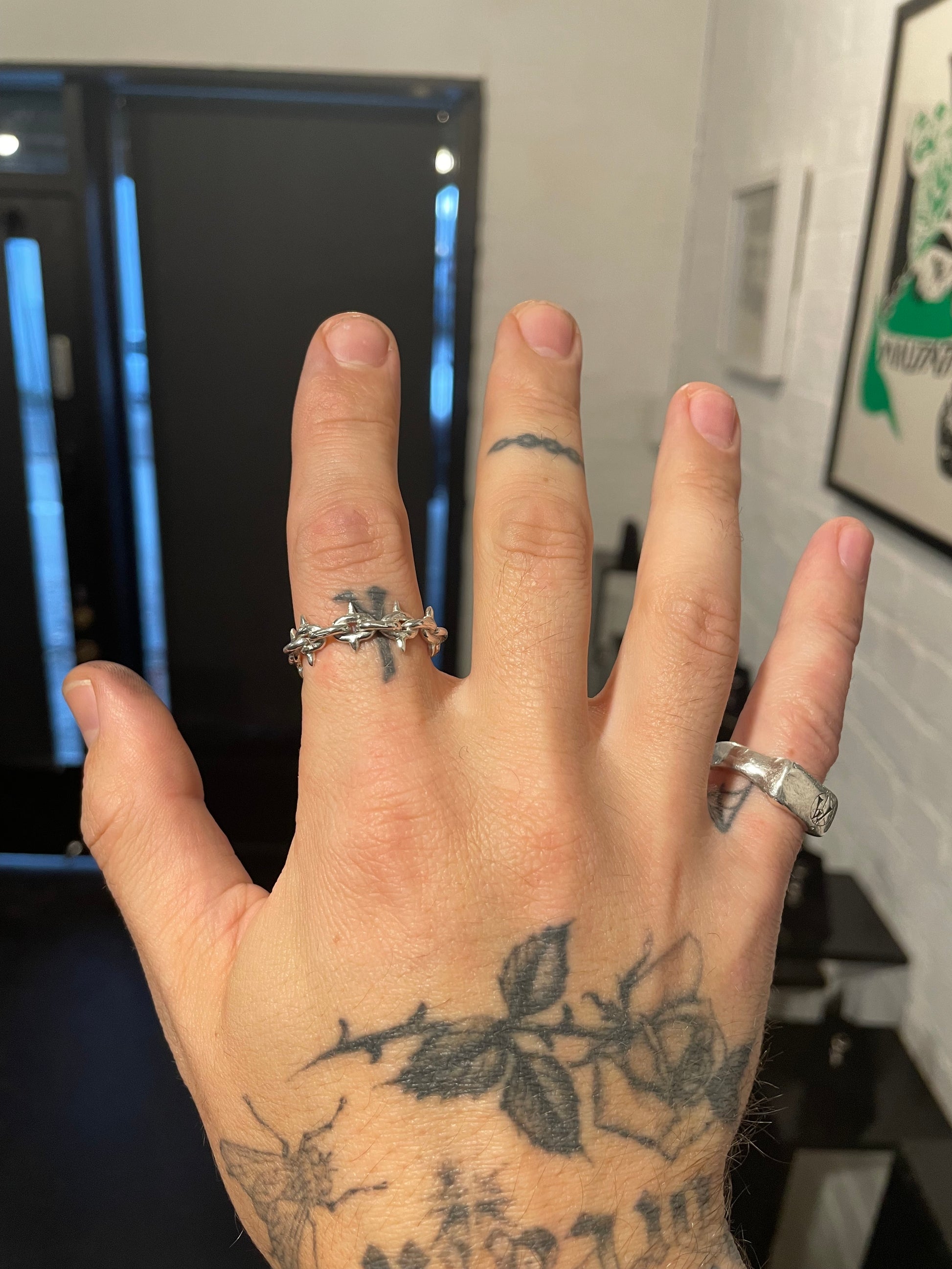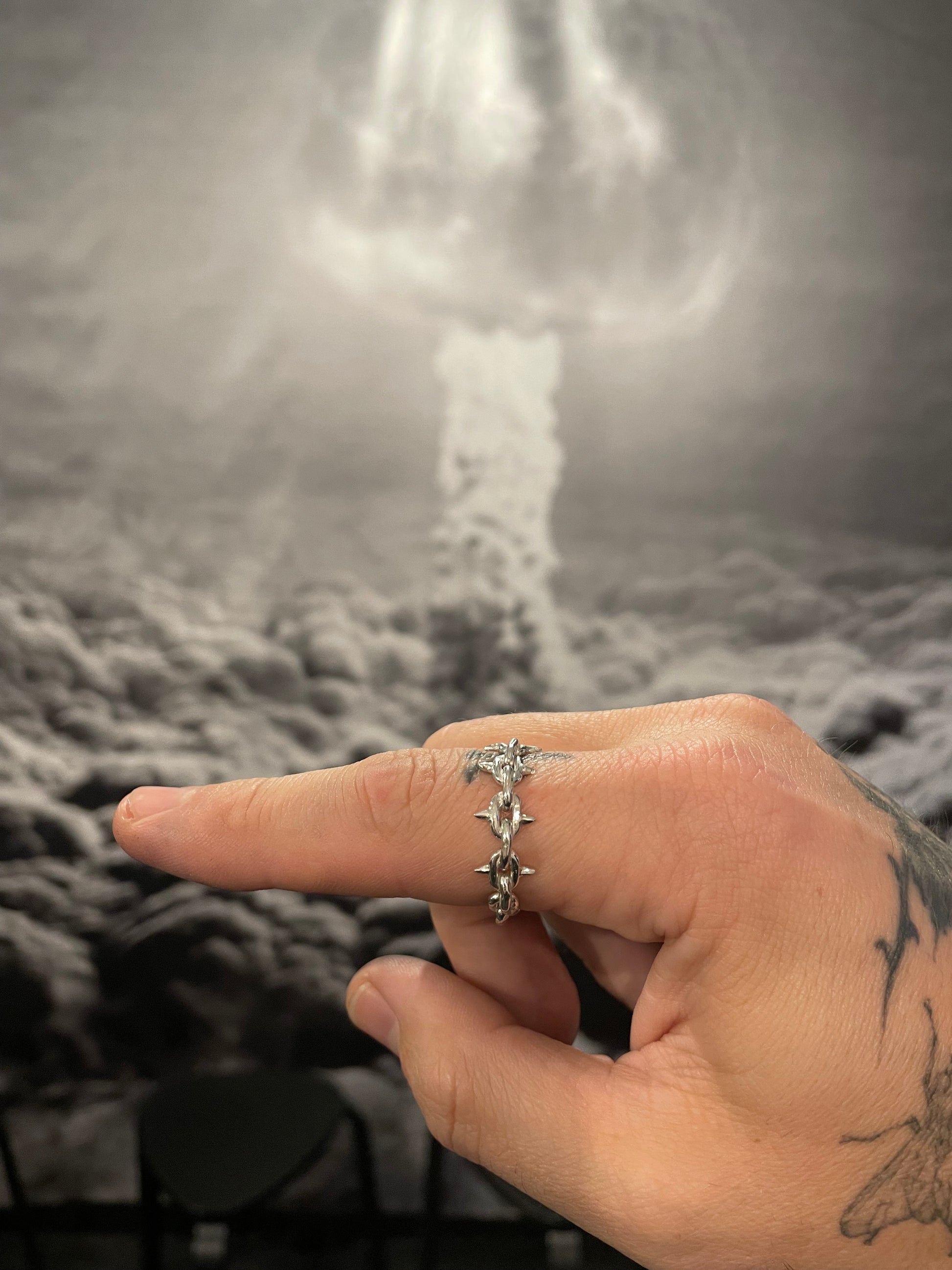 Chain links of silver thorns, continuing my slight obsession with impractical, minor-injury-causing jewellery. Funnily enough.. this is the most sensible out of my sharp objects - the points are dulled slightly and sit parallel to the skin, as to not cause damage. This one's a winner, folks.