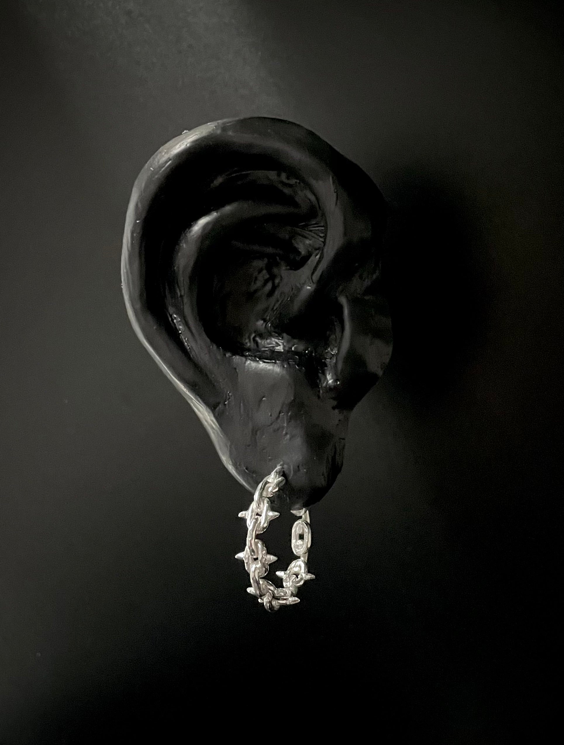 Chain links of silver thorns formed into open hoops.